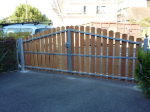 Portail à 2 vantaux damettes mélèze naturel, structure zinguée
